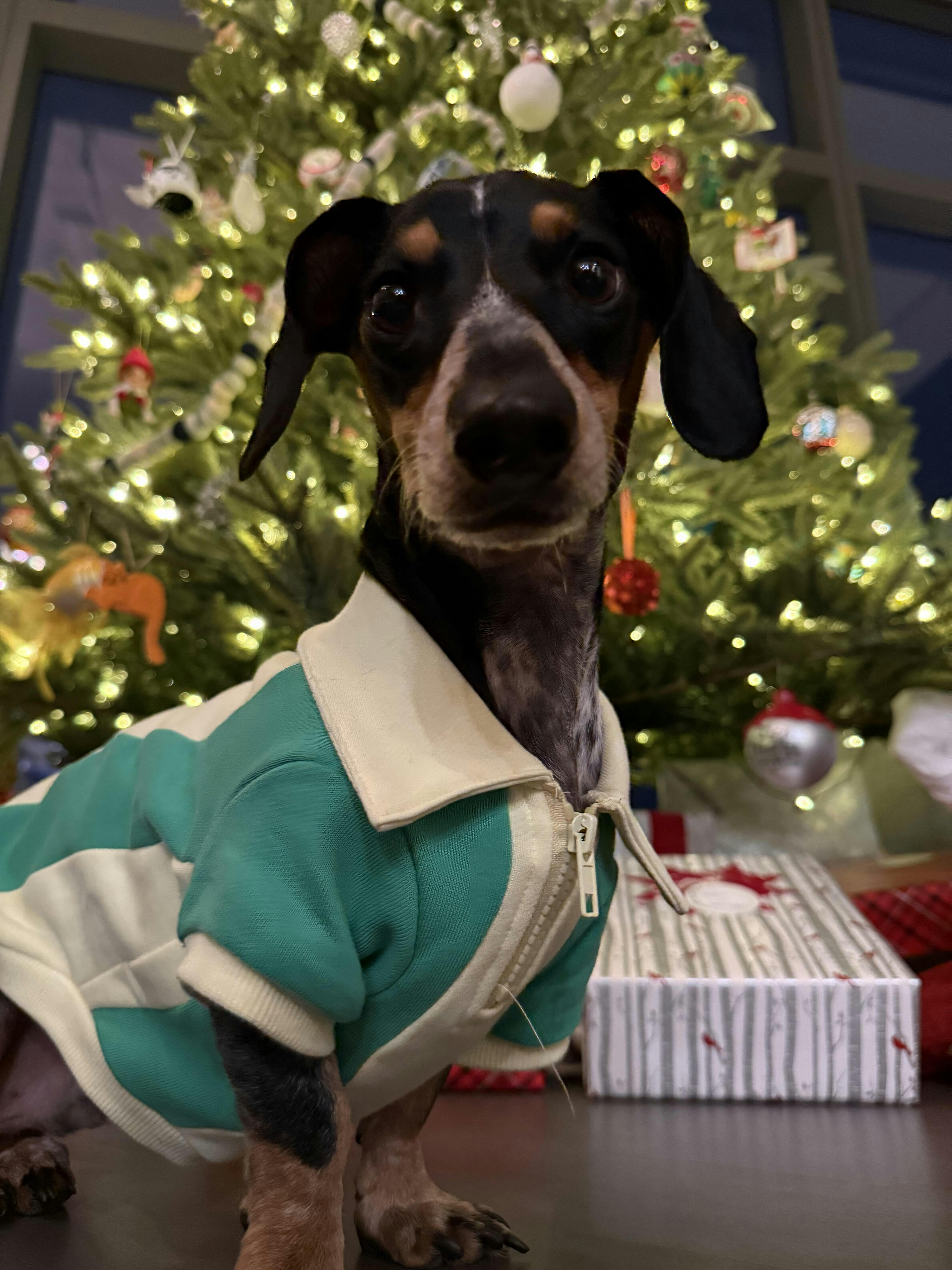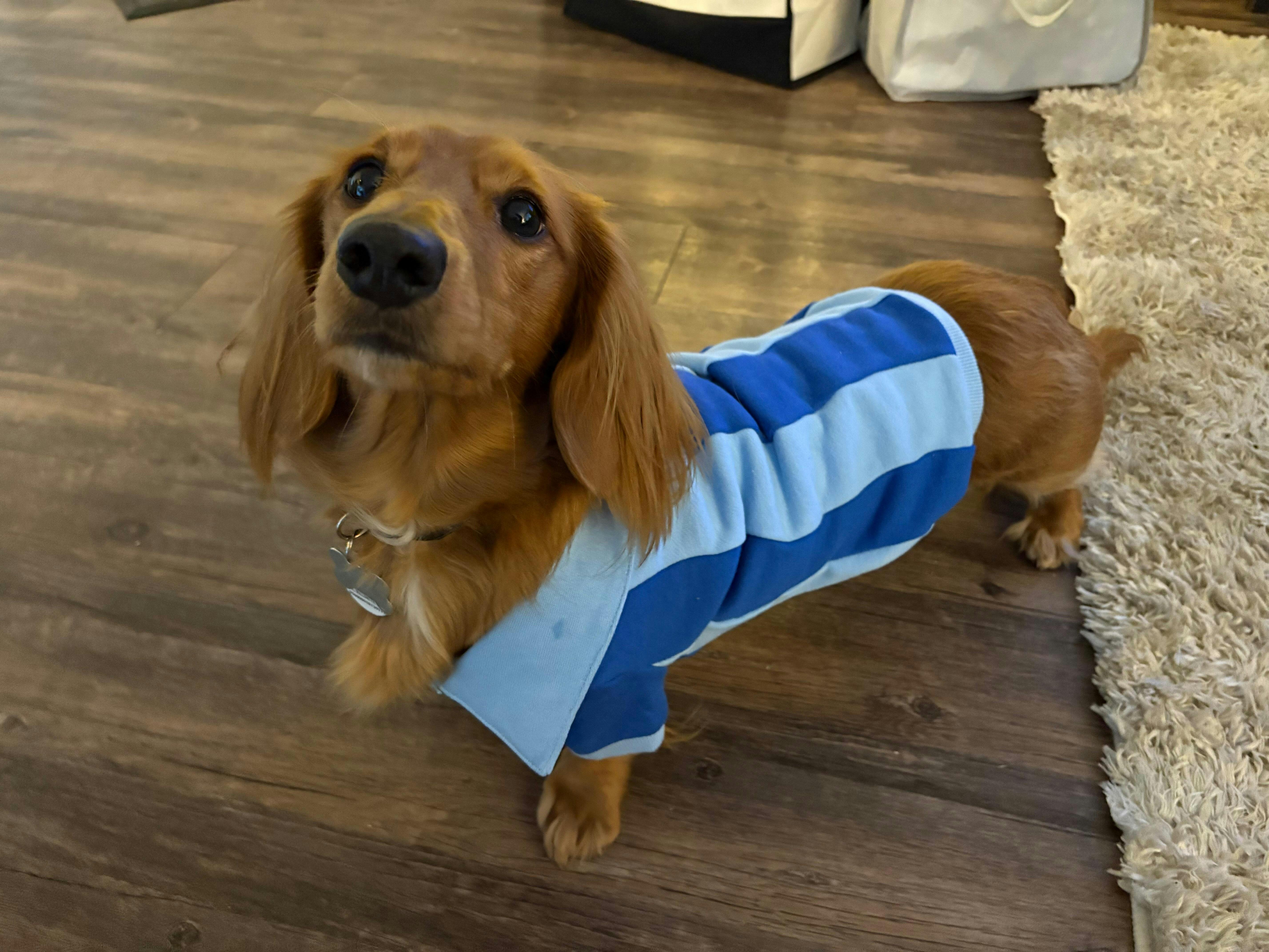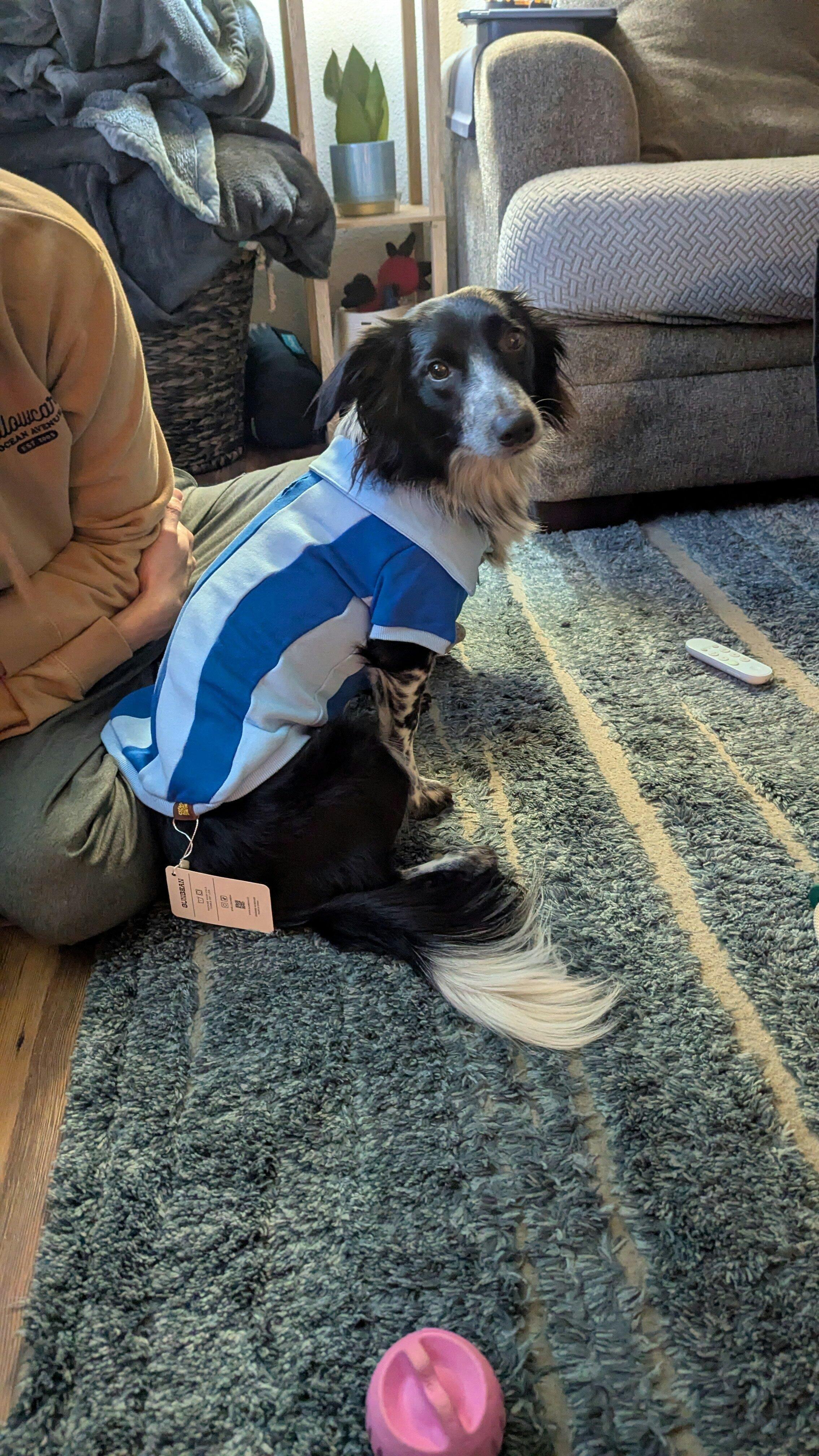 Made from 100% breathable cotton, this athleisure set features a human quarter-zip top, comfy pants, and a matching quarter-zip pullover for your furry friend.